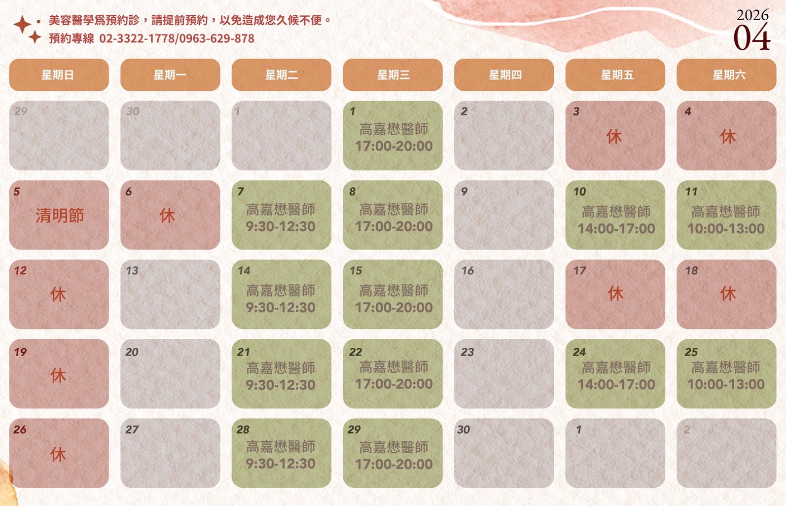 週一:12:30~20:00 週二:11:30~20:00 週三:09:00~16:30 週四:12:30~20:00 週五:12:30~20:00 週六:09:00~17:30 電子信箱: service@keywayclinic.com